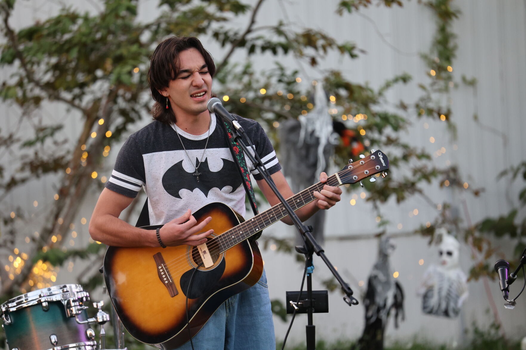 Noah Gonzalez-Hall, junior creative writing major, sings and plays his guitar at the UCF Arboretum on Thursday as part of the Arboretum Unplugged festival. Gonzalez-Hall was the first act in the arboretum's first night of the event.